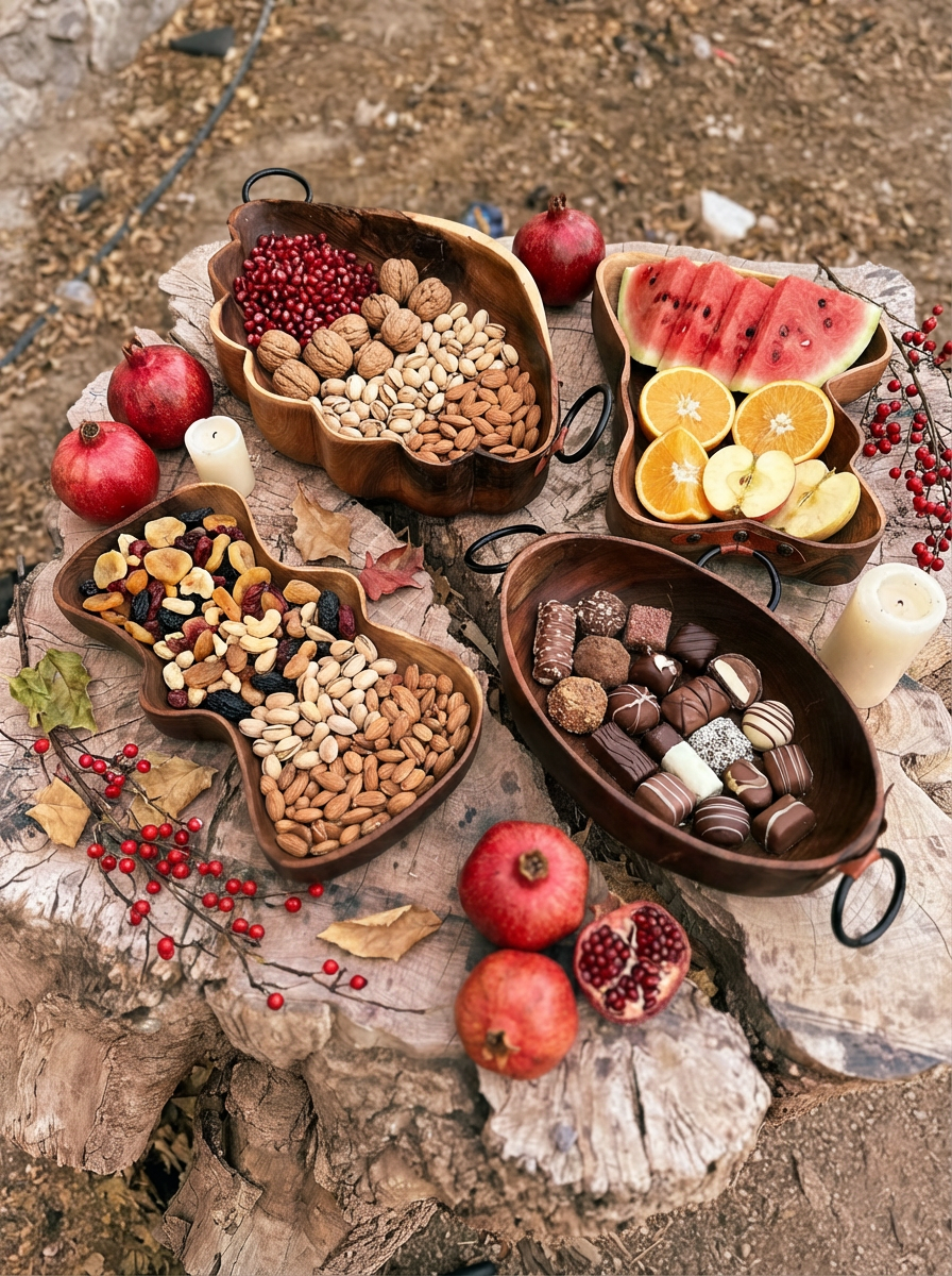 این محصول یک سرویس پذیرایی چهار تکه با طراحی روستیک (Rustic) است که برای سرو انواع تنقلات، مزهها، آجیل، خشکبار، میوه یا شیرینی در دورهمیها استفاده میشود.